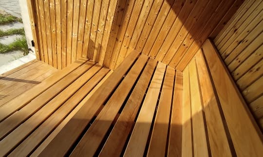 Celoprosklená přední část sauny, tvořená izolačním dvojsklem v hliníkovém rámu, umožňuje krásný výhled do okolí a vytváří jedinečnou atmosféru při saunování. Dvouúrovňová lavice naproti prosklené stěně poskytuje maximální pohodlí a komfort.